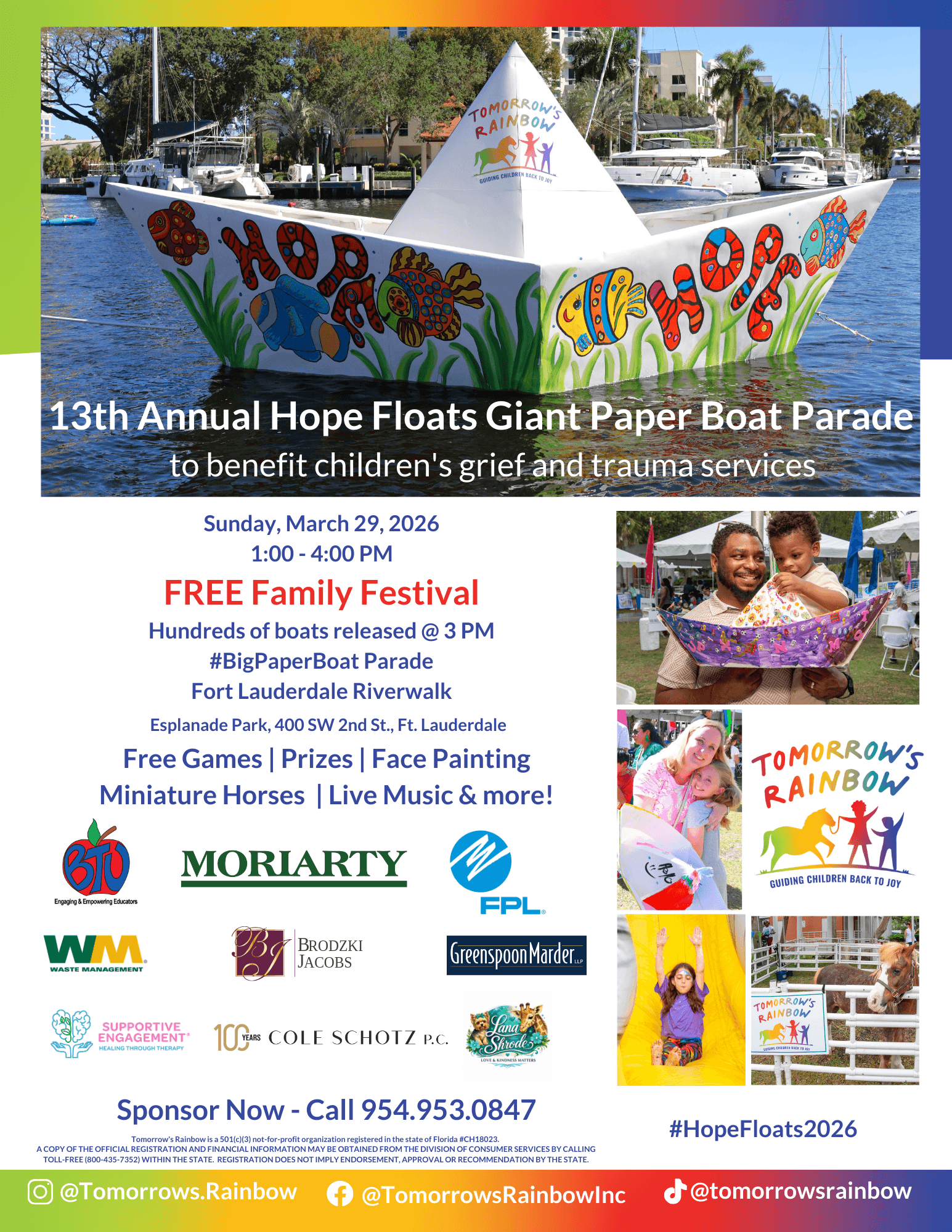 Hope Floats Benefiting Tomorrow’s Rainbow is a heartfelt, free family festival open to participants of all ages, created to celebrate the lives of those who are no longer with us but remain in our hearts forever. Everyone is invited to attend and encouraged to decorate paper boats in honor of their loved ones. The proceeds from Hope Floats support children, families, and individuals in our community who are healing from grief and trauma with the help of Tomorrow’s Rainbow services.