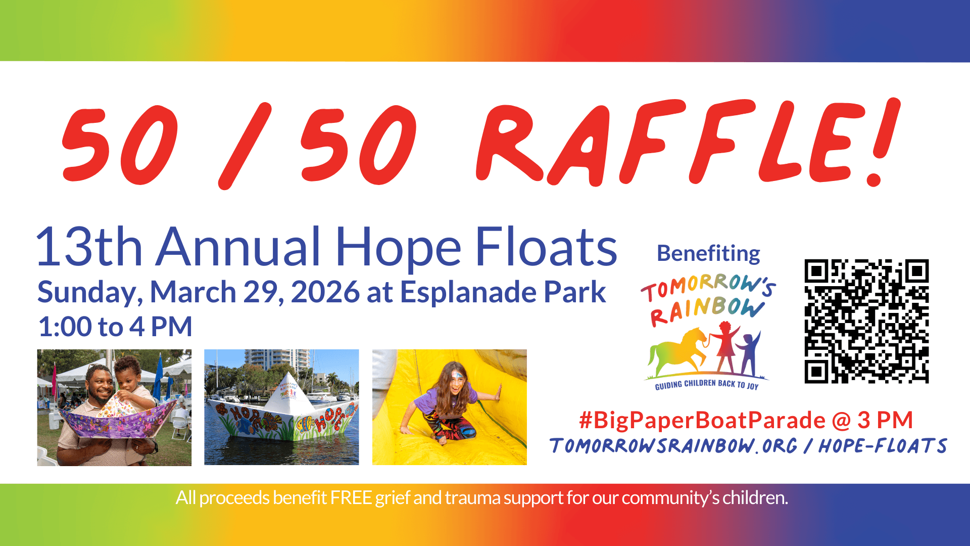 Join the Tomorrow's Rainbow Hope Floats 50/50 Raffle! This is your chance to win 50% of the total pot collected—while the other 50% goes directly to supporting grief and trauma support programming for children and families at Tomorrow's Rainbow. Every ticket brings hope and healing to those coping with loss. Don’t miss out on this exciting opportunity to make a difference and possibly take home a prize!